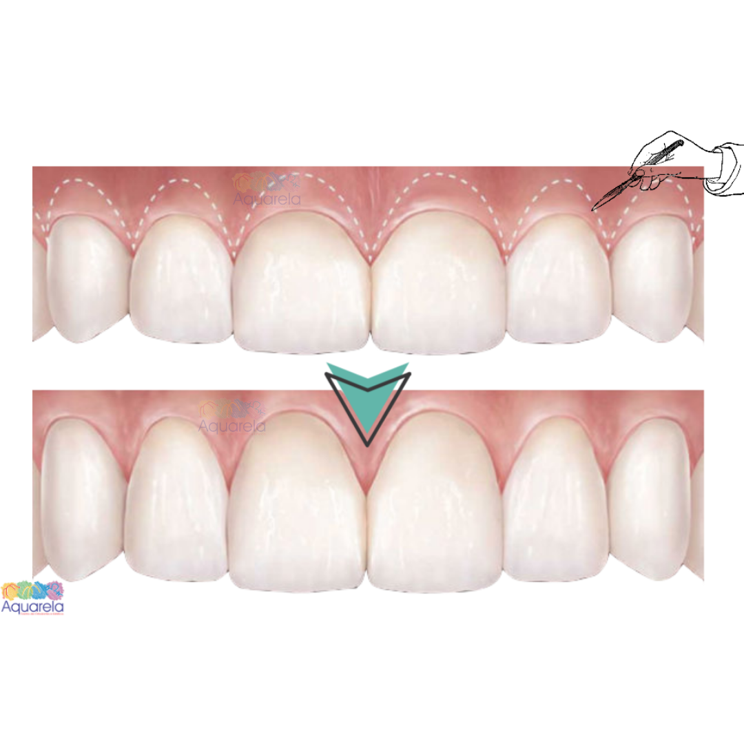Para o tratamento do primeiro caso, é sugerido a realização de uma gengivoplastia, removendo uma pequena porção da gengiva, diminuído a exposição gengival e, consequentemente, aumentando o tamanho dos dentes no sorriso.